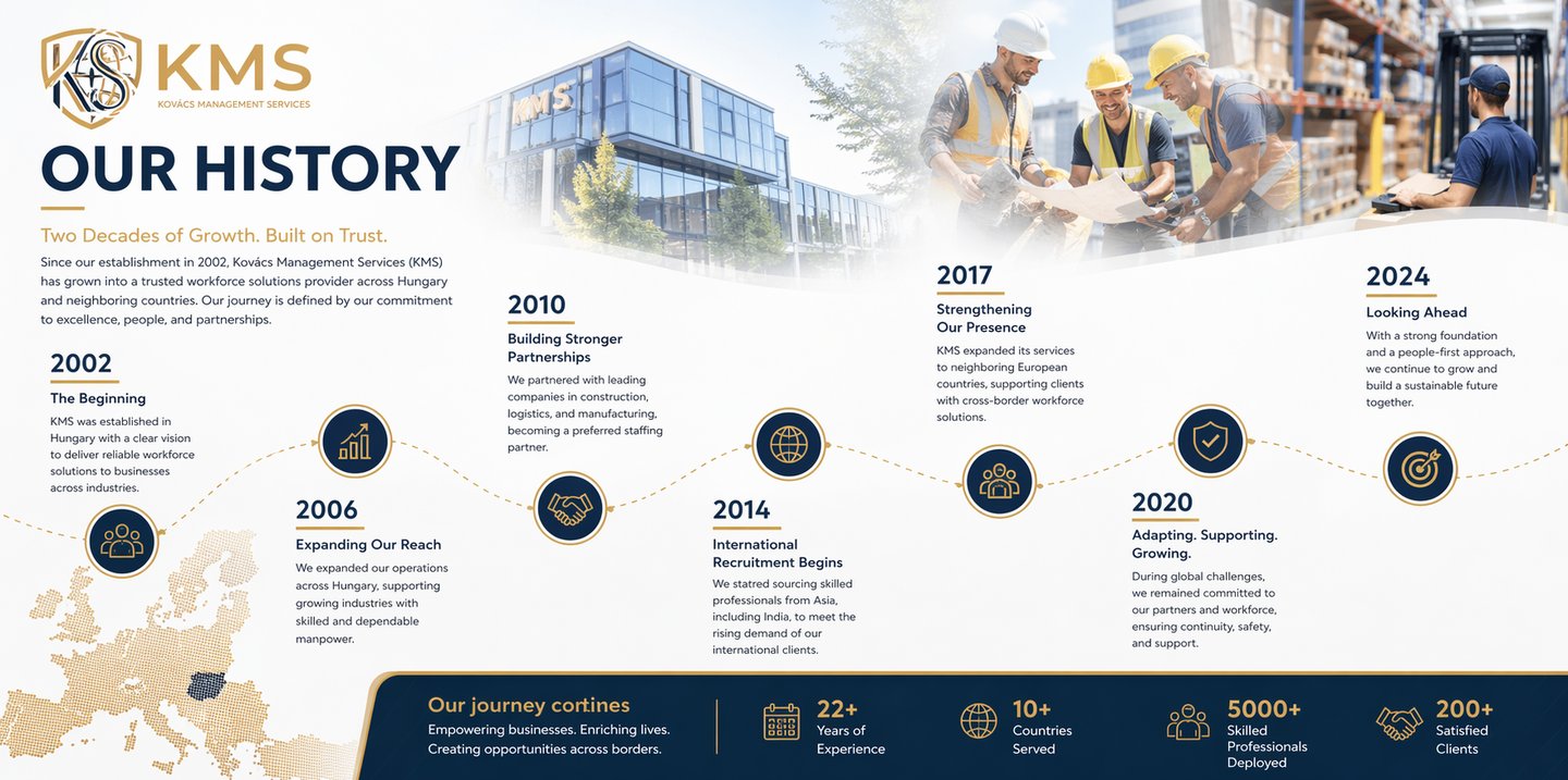 Kovács Management Services (KMS) established in 2002, is a Hungary-based workforce solutions provider, connecting skilled talent from Europe and Asia with leading industries across Hungary and neighbouring countries.
